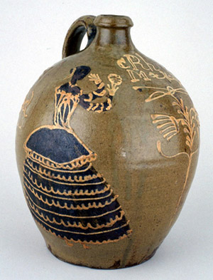 Fig. 6. Jug signed “C Rhodes / Maker” depicting hoop-skirted belle in two colors of slip, ca. 1850. H. 13.25 inches. Collection of Abby Aldrich Rockefeller Folk Art Museum, Colonial Williamsburg Foundation, Williamsburg, Virginia.